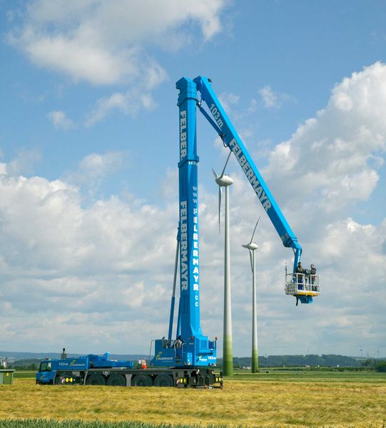 Felbermayr offers two state-of-the-art work platforms, the F-90 LTK and the F-103 LTK, which have been specially developed for operation at extreme heights. The two truck platforms, which are among the highest in the world, enabling safe and efficient work at heights of up to 90 and 103 metres respectively. This makes them ideally suited to the challenges of the wind energy sector.